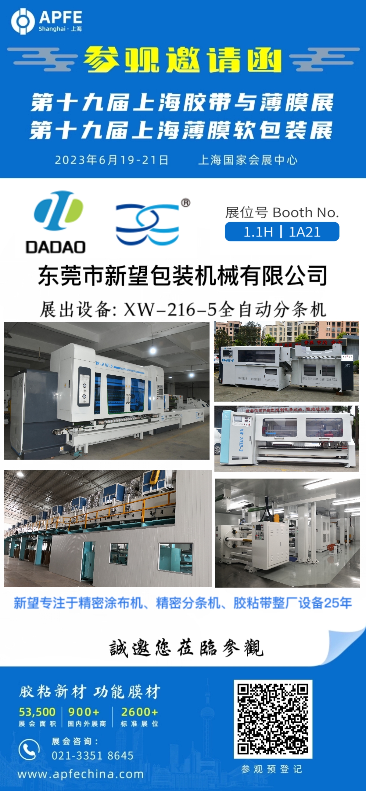 #第十九屆上海國際膠帶與薄膜展覽會(huì )#第十九屆上海國際薄膜軟包裝展覽會(huì ) 2023年6月19日至21日 上海國家會(huì )展中心1.1H館 展位號1A21,期待您的蒞臨指導,與您不見(jiàn)不散